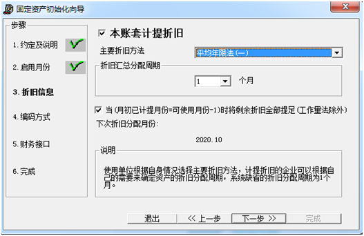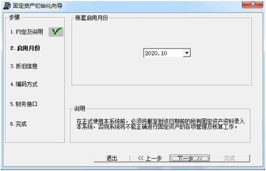 ③单击“下一步”按钮,打开“固定资产初始化向导——启用月份”对话框。选择账套启用月份“2020.10”,如图所示: