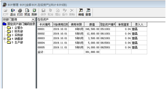 ④同理,完成其他固定资产卡片的输入。全部原始卡片输入完成后退出。在“卡片管理”中进行查看,如下图所示: