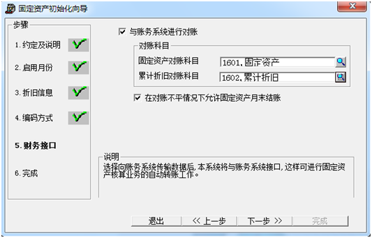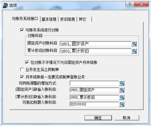 财务接口 | 与财务系统进行对账 对账科目: 固定资产对账科目:1601固定资产 累计折旧对账科目:1602累计折旧 |