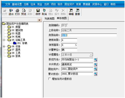 编码 | 类别名称 | 净残值率 | 单位 | 计提属性 | 卡片样式 |