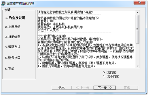②单击“是”按钮确认,打开固定资产初始化向导。在“固定资产初始化向导——约定及说明”对话框中,仔细阅读相关条款,选中“我同意”单选按钮,如图所示: