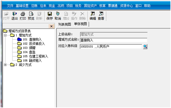①选择“固定资产”|“设置”|“增减方式”命令,打开“增减方式”对话框。