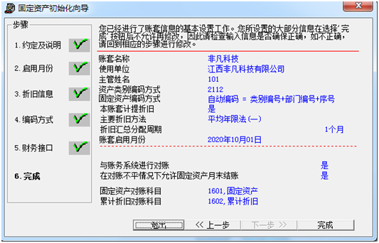 补充参数 | 月末结账前一定要完成制单登账业务 固定资产默认入账科目:1601,累计折旧默认入账科目:1602 可抵扣税额入账科目:22210101 |