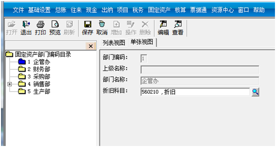 注意:如果国内销售部和国际销售部对应的折旧科目相同,则可以将折旧科目设置在销售部,保存后单击“刷新”按钮,其下属部门自动继承。