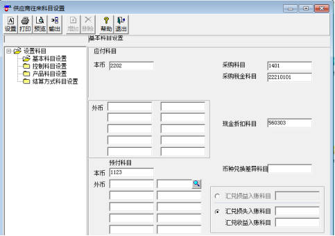 ②单击“基本科目设置”,输入对应科目:应付科目本币为2202、采购科目为1401、采购税金科目为22210101、预付科目本币为1123.