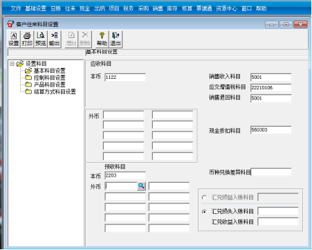 ②单击“基本科目设置”输入对应科目:应收科目本币为1122、预收科目本币为2203、销售收入科目为5001、应交增值税科目为22210106、销售退回科目为5001、现金折扣科目为560303。