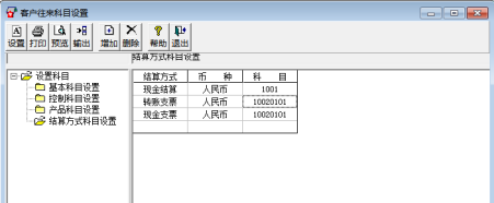 ③单击“结算方式科目设置”输入对应科目:现金结算对应科目为1001、转账支票对应科目为10020101、现金支票结算对应科目为10020101.