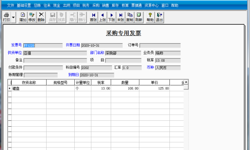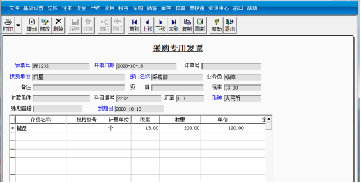 ③输入开票日期为“2020-10-18”、发票号为FP1232,选择客户名称为“日星”、部门名称为“采购部”、科目编码为2202,输入存货名称“键盘”、数量200,单价系统自动给出,修改为120,然后单击“保存”按钮。