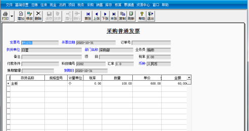 ②单击“增加”按钮,输入入库日期为“2020-10-31”,选择仓库为“材料一库”、供货单位为“日星”、部门为“采购部”、入库类别为“采购入库”、采购类型为“普通采购”