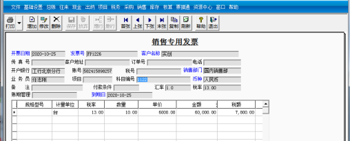 ③输入开票日期为“2020-10-25”、发票号为FP1226,选择客户名称为“实创”、销售部门为“国内销售部”科目编号为1122,输入货物名称“华宇天骄”、数量为10、单价为6000.然后单击“保存”按钮。