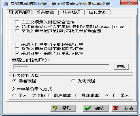 ④单击“确定”按钮返回,然后单击“确定”按钮完成采购选项设置。