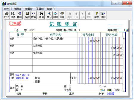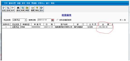(4)2020年11月15日,财务部收到瑞美公司转账支票一张,票号为ZP0115,金额为150000元。应收会计进行收款结算并核销应收。