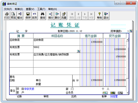 ③在核算管理子系统中,选择“核算”|“凭证”|“客户往来制单”命令,打开“客户制单查询”对话框。选中“发票制单”复选框,单击“确认”按钮,选择要制单的单据,单击“制单”按钮,屏幕上出现根据发票生成的转账凭证。