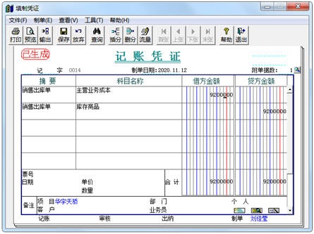 (4)在核算管理子系统中对销售出库单记账并生成凭证