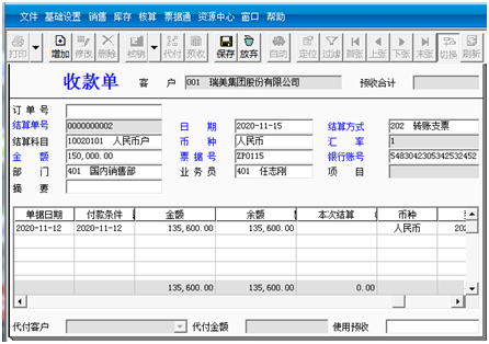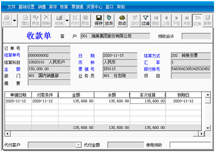 ②然后单击“保存”按钮。单击“核销”按钮,收款单下方窗口中显示该客户未核销的应收款。在要核销的单据的本次结算栏中输入135600.