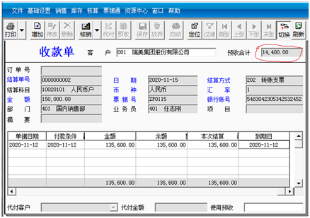 ③单击“保存”按钮,预收合计显示为14400