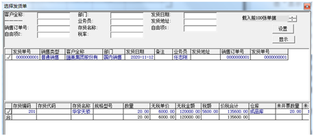 ①在销售管理子系统中,选择“销售”|“销售发票”命令,单击“增加”下拉按钮,选择“专用发票”。单击“选单”下拉按钮,选择“发货单”,打开“选择发货单”对话框。单击“显示”按钮,列出可参照的发货单。选择发货单,单击“确认”按钮,将发货单信息带入销售专用发票。