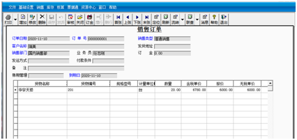 ②单击“增加”按钮,输入订单日期为2020-11-10,选择销售类型为“普通销售”、客户名称为“瑞美”、销售部门为“国内销售部”。选择货物名称为“华宇天骄”,输入数量为20、报价为6000、预发货日期为2020-11-12。然后单击“保存”按钮。