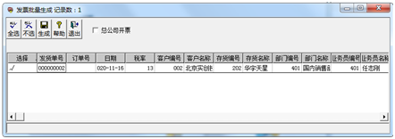 ②选择要生成发票的发货单,单击“生成”按钮,系统弹出“发货单生成发票成功”信息提示框,关闭返回。