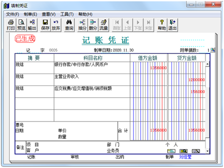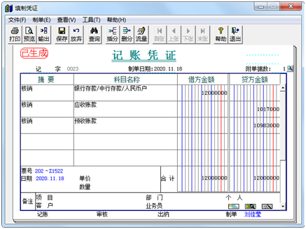 在核算管理子系统中,选择“凭证”|“客户往来制单”命令,打开“客户制单查询”对话框。选中“现结制单”复选框,单击“确认”按钮,打开“现结制单”对话框。选中要制单的记录,单击“制单”按钮,生成以下凭证。