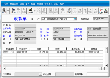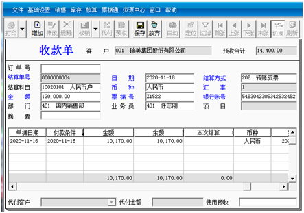 ②选择客户为“瑞美”,单击“增加”按钮。选择结算方式为“202转账支票”,输入金额为120000、票号为Z1522
