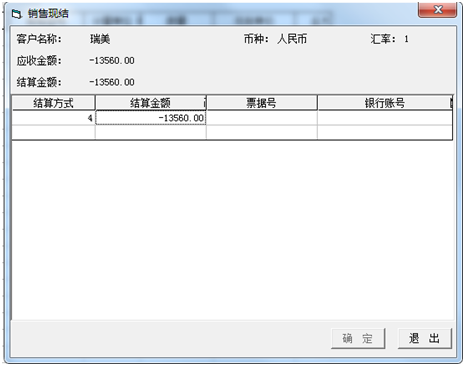 ④单击“现结”按钮,打开“销售现结”对话框。选择结算方式为“4 电汇”,输入结算金额为-13560,然后单击“确定”按钮,系统提示“现结记录以保存!”。