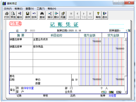 ③单击“保存”按钮,输入项目核算科目主营业务收入的核算项目为“华宇天星”,凭证左上角出现“已生成”红字凭证,表示凭证已传递到总账管理子系统。