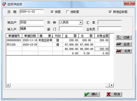 ②选择转出户为“实创”、转入户为“瑞美”,然后单击“过滤”按钮。系统列出实创的应收款,确认并账金额200。单击“确认”按钮,系统弹出“操作成功?”信息提示框。单击“确定”按钮返回。