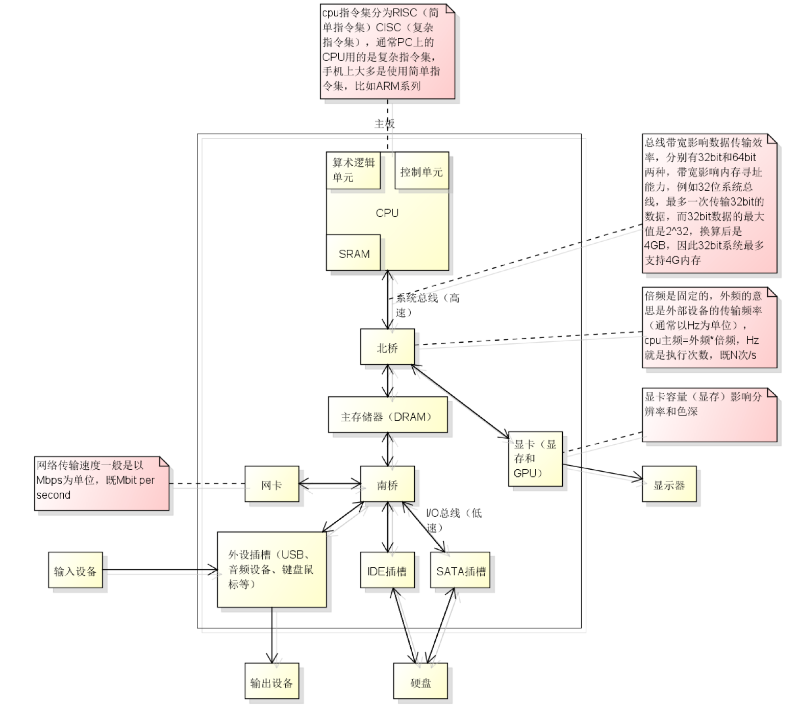 通常来说,计算机要控制和协调各个组件,需要通过主板来进行。如果cpu是大脑,那么主板就好像神经系统一样。主板最重要的组件是一个芯片组,这个芯片组就是北桥和南桥了,主板的北桥负责实现主存储器(RAM)、显示适配器(即显卡)与cpu的沟通,然后再通过北桥连往cpu的总线,将数据传给cpu(注意,这里指的是Intel的构架,AMD则直接将主存储器和cpu连接而不通过北桥),北桥通往cpu的总线,因为需要连接主存储器和显示适配器等,因此需要极高的速度,我们把这条总线称之为系统总线,总线一次能传输的数据一般是32bit和64bit两种,而这些连接北桥通往cpu的设备,又有一个用来衡量传输能力的标准,叫做外频。例如,如果外频是333MHz的话,就意味著这些连接北桥的设备,每秒进行3.33*10^6次传输。计算机中还有一个被固定死的倍频,cpu的主频(及每秒运作多少次)=外频*倍频,据说是为了协调高速cpu与低速外部设备而设计的。外部设备的每秒数据传输量=每秒传输多少次*总线宽度。