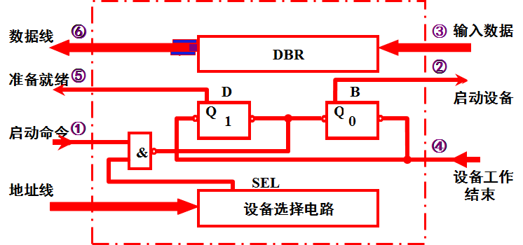 图中设备选择电路用以识别本设备地址,当地址线的设备号与本设备号相符时,SEL有效,可以接收命令;数据缓冲寄存患有和于存放欲传送的数据;D是完成触发器,B是工作触发器。