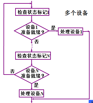 由CPU执行一段输入输出程序来实现主机与外设之间数据传送,为了保证数据传送的正确进行,就要求CPU在程序中查询外设的工作状态。如果外设尚未准备就绪,CPU就循环等待,只有当外设已作好准备,CPU才能执行I/O指令进行数据传送,这就是程序查询方式。