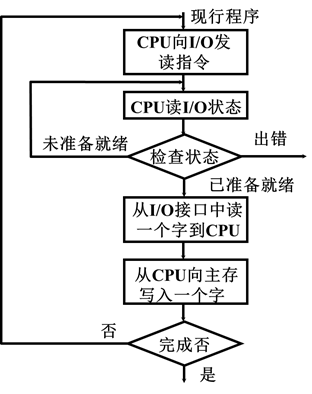 由这个查询过程可见,只要一启动I/O设备,CPU便不断查询I/O设备的准备情况,从而终止了原程序的执行。CPU在反复查询过程中,犹如原地踏步。另一方面,I/O设备准备就绪后,CPU要一个字一个字地从I/O设备取出,经CPU送至主存,此刻CPU也不能执行原程序,可见这种方式使CPU和I/O设备处于串行工作状态,CPU的工作效率不高。