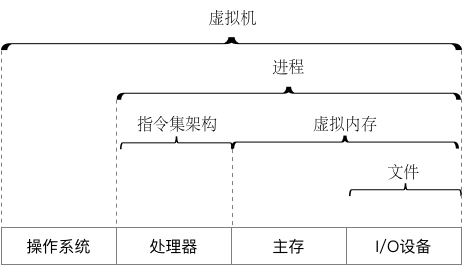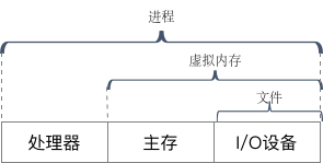 文件是对I/O设备的抽象表示, 虚拟内存是对主存和磁盘I/O设备的抽象表示, 进程则是对处理器、主存和I/O设备的抽象表示。