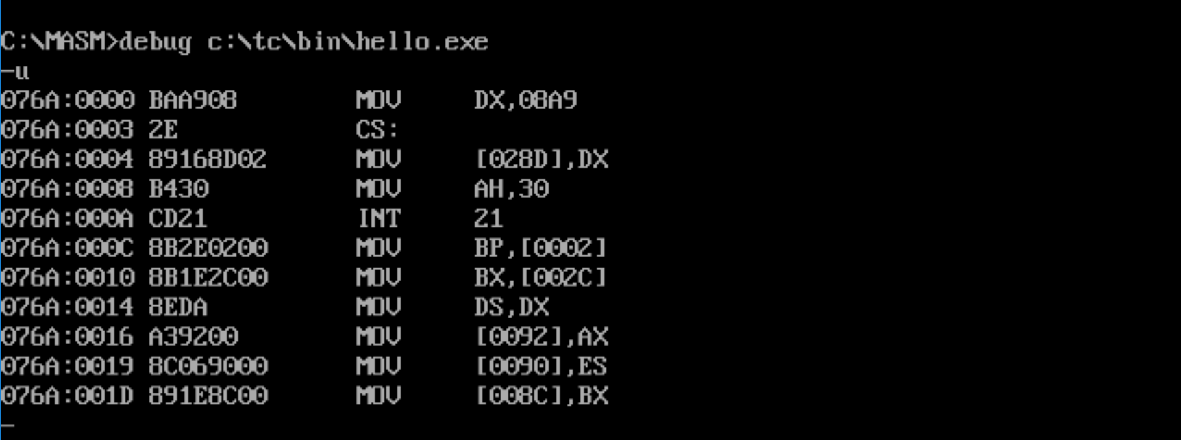hello.c经过编译后成为hello.exe可执行文件, 通过对exe文件进行反汇编, 得到对应的汇编语言程序。