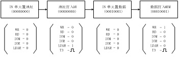 由前面的存储器实验原理图(图2-3)可以看出,由于数据和地址由同一个数据开关给出,因此数据和地址要分时写入,先写地址,具体操作步骤为:先关掉存储器的读写(WR=0,RD=0),数据开关输出地址(IOR=0),然后打开地址寄存器门控信号(LDAR=1),按动ST产生T3脉冲,即将地址打入到AR中。再写数据,具体操作步骤为:先关掉存储器的读写(WR=0,RD=0)和地址寄存器门控信号(LDAR=0),数据开关输出要写入的数据,打开输入三态门(IOR=0),然后使存储器处于写状态(WR=1,RD=0,IOM=0),按动ST产生T3脉冲,即将数据打入到存储器中。写存储器的流程如图2-6所示(以向00地址单元写入11H为例):