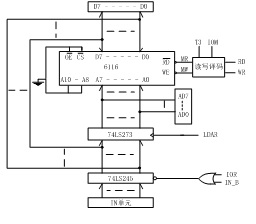 实验原理图及数据通路图如图2-3、2-4所示,存储器数据线接至数据总线,数据总线上接有8个LED灯显示D7…D0的内容。地址线接至地址总线,地址总线上接有8个LED灯显示A7…A0的内容,地址由地址锁存器(74LS273,位于PC&AR单元)给出。数据开关(位于IN单元)经一个三态门(74LS245)连至数据总线,分时给出地址和数据。地址寄存器为8位,接入6116的地址A7…A0,6116的高三位地址A10…A8接地,所以其实际容量为256字节。