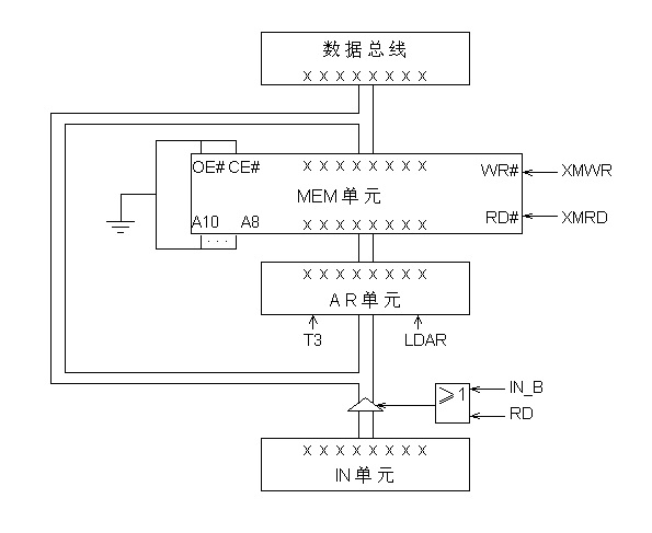 同写操作类似,也要先给出地址,然后进行读,地址的给出和前面一样,而在进行读操作时,应先关闭IN单元的输出,然后使存储器处于读状态,此时数据总线上的数即为从存储器当前地址中读出的数据内容。