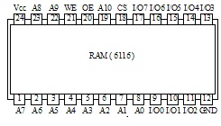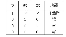实验所用的静态存储器由一片6116(2K×8bit)构成(位于MEM单元),如图2-1所示。6116有三个控制线:CS(片选线)、OE(读线)、WE(写线),其功能如表2-1所示,当片选有效(CS=0)时,OE=0时进行读操作,WE=0时进行写操作,本实验将CS常接地。