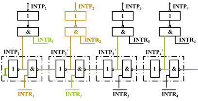 硬件判优法是指采用硬件判优电路实现中断优先级的判定,根据中断请求信号的传送方式不同,有不同的优先排队电路,常见的方案有:独立请求线的优先排队电路、公共请求线的优先排队电路等。这些排队电路的共同特点是:优先级别高的中断请求将自动封锁优先级别低的中断请求的处理。硬件排队电路一旦设计连接好之后,将无法改变其优先级别。但是这种方法可节省CPU时间,而且速度快,但是成本较高。