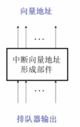 中断向量地址形成部件实际上这是一个设备编码器,它的输入就是刚才讲的排对器输出的结果,在这个结果当中,只有一位是高电平的,它的输出对应的是中断向量地址,也就是中断服务程序的入口地址所保存的那个内存单元的地址。