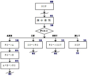 几条机器指令对应的参考微程序流程图如图3-3所示。图中一个矩形方框表示一条微指令,方框中的内容为该指令执行的微操作,右上角的数字是该条指令的微地址,右下角的数字是该条指令的后续微地址,所有微地址均用16进制表示。向下的箭头指出了下一条要执行的指令。P<1>为测试字,根据条件使微程序产生分支。
