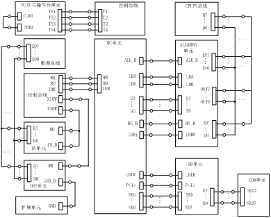 实验中机器指令由CON单元的二进制开关手动给出,其余单元的控制信号均由微程序控制器自动产生,为此可以设计出相应的数据通路图,见图3-2所示。