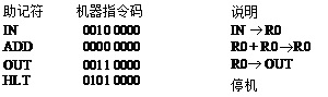 本实验安排了四条机器指令,分别为ADD(0000 0000)、IN(00100000)、OUT(00110000)和HLT(01010000),括号中为各指令的二进制代码,指令格式如下: