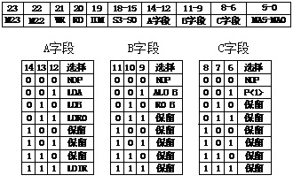 微指令字长共24位,控制位顺序如表3-1所示。其中MA5…MA0为6位的后续微地址,A、B、C为三个译码字段,分别由三个控制位译码出多位。C字段中的P<1>为测试字位。其功能是根据机器指令及相应微代码进行译码,使微程序转入相应的微地址入口,从而实现完成对指令的识别,并实现微程序的分支。