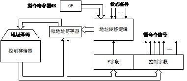 微程序控制器的基本任务是完成当前指令的翻译和执行,即将当前指令的功能转换成可以控制的硬件逻辑部件工作的微命令序列,完成数据传送和各种处理操作。它的执行方法就是将控制各部件动作的微命令的集合进行编码,即将微命令的集合仿照机器指令一样,用数字代码的形式表示,这种表示称为微指令。这样就可以用一个微指令序列表示一条机器指令,这种微指令序列称为微程序。微程序存储在一种专用的存储器中,称为控制存储器,微程序控制器原理框图如图3-1所示。
