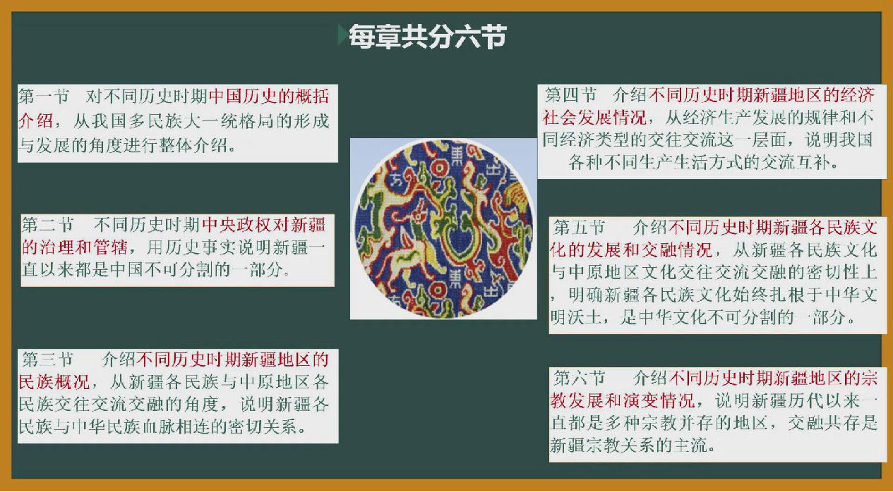 具体讲,从中国多民族大一统历史进程、中央政权对新疆地区的治理、新疆多民族的分布与交融、新疆地区经济的发展、新疆各民族文化始终扎根中华文明沃土、新疆地区多种宗教并存格局的演变等6方面谋篇布局、准确阐述,基本上反映了新疆地区历史发展的总体趋势、历史主流和前进方向。