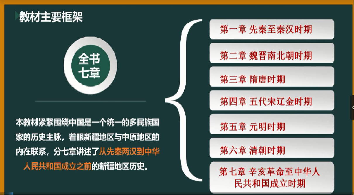 《简明新疆地方史教程》这门课程紧紧围绕中国是一个统一的多民族国家的历史主脉,着眼新疆地区与中原等地区的内在联系,分7章讲述了从先秦两汉到中华人民共和国成立之前的新疆地区历史。