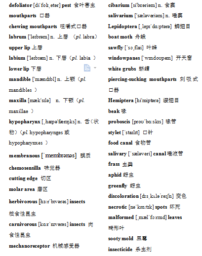昆虫的口器(mouthparts)就是昆虫的取食器官,位于头部的下方或前端,一般由上唇、下唇、舌、上颚、下颚 5 部分组成, 其中上颚、下颚、下唇是由昆虫头部附肢演变而成,而舌能帮助运送和吞咽食物,并且有味觉作用。