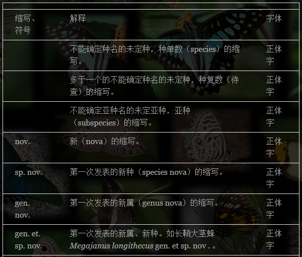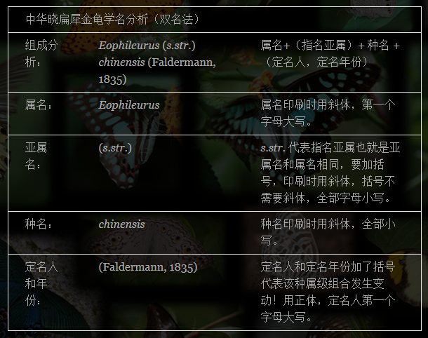 (1)当我们鉴定一种昆虫,只鉴定到属而不知道具体种,我们可以用属名+sp. 来表示不能确定种名的未定种。如叉犀金龟属的某个种就用 Allomyrina sp. 来表示。sp. 是种单数(species)的缩写。表示属的一个以上种时,则可以用种复数 spp. 表示。