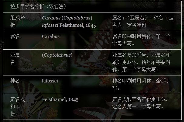 定名人和定名年份都用正体字,定名人第一个字母要大写。如 Carabus (Coptolabrus) lafossei Feisthamel, 1845 。■属名缩写